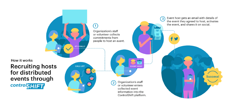 - Send an email to your list. The easiest way for many organizations to recruit hosts quickly is to send an email to their supporters asking them to run an event in their area. Tools like ControlShift allow your organization to provide each supporter with a guide for hosting their event, while supporters can quickly and easily set up and share their events. It’s also a good idea to have an organizer call through the list of hosts to confirm the details of their events and walk each host through what you expect them to accomplish at their event.