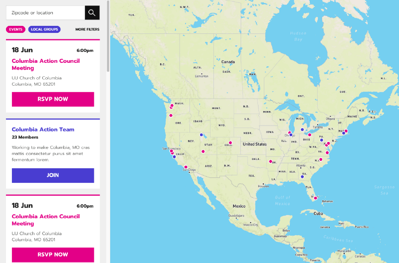 Putting all of your organizing on a map helps supporters find opportunities to get involved near them, highlights the reach of your community, and visualizes the depth of the organizing that your team is leading.