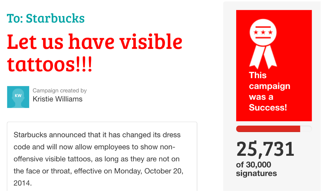 Like millions of people, Kristie Williams, a (former) Starbucks worker in Georgia, has tattoos, including on her arms. But thanks to the restrictive Starbucks dress code, which didn't permit visible tattoos, she had to keep her arms covered all day, even in the heat of summer. Kristie wanted to change this, so when Coworker emailed their community of Starbucks workers to solicit campaign ideas, she knew what to do. Not long after launching her campaign, it went absolutely viral! More than 25,000 people signed the petition, including thousands of Starbucks workers, and it received news coverage from major national outlets including CNN and USA Today.